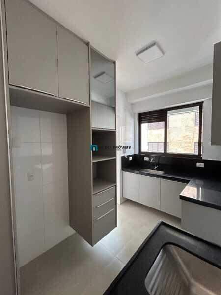 A cozinha é bem planejada, com armários sob medida e piso em porcelanato polido, proporcionando funcionalidade e elegância. A área de serviço segue o mesmo padrão, com armários e piso em porcelanato polido, garantindo um ambiente organizado e bem aproveitado.