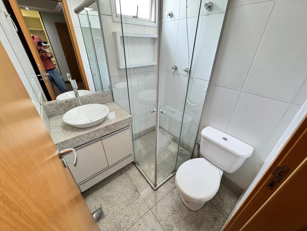 Banheiro social espaçoso com espelho, pia em cuba, bancada em granito, armário e box em blindex