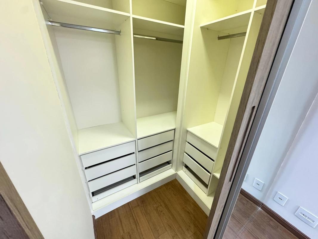 3 quartos amplos com piso em vinílico de madeira, iluminação e móveis planejados, sendo uma suíte com espelho, pia em cuba, bancada em granito, armário e box em blindex
