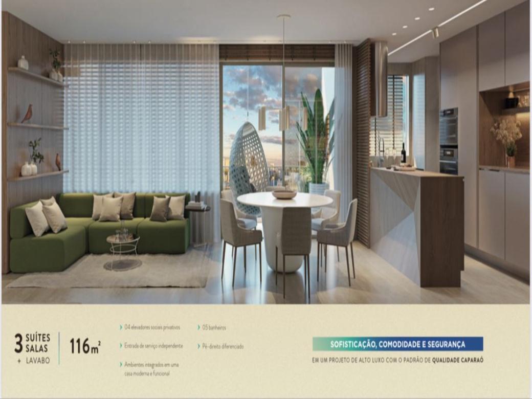 Sala ampla facilitando layouts para 03 ambientes, lavabo, 03 quartos com 03 suites, 02 vagas de garagem para aptos tipo.