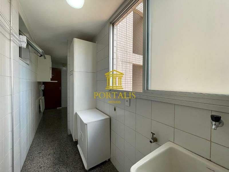 Área de serviço com tanque e armários.