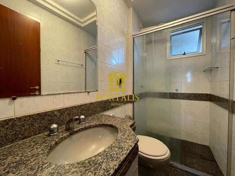 Banheiro social com bancada em granito, armários, espelho e box em blindex.