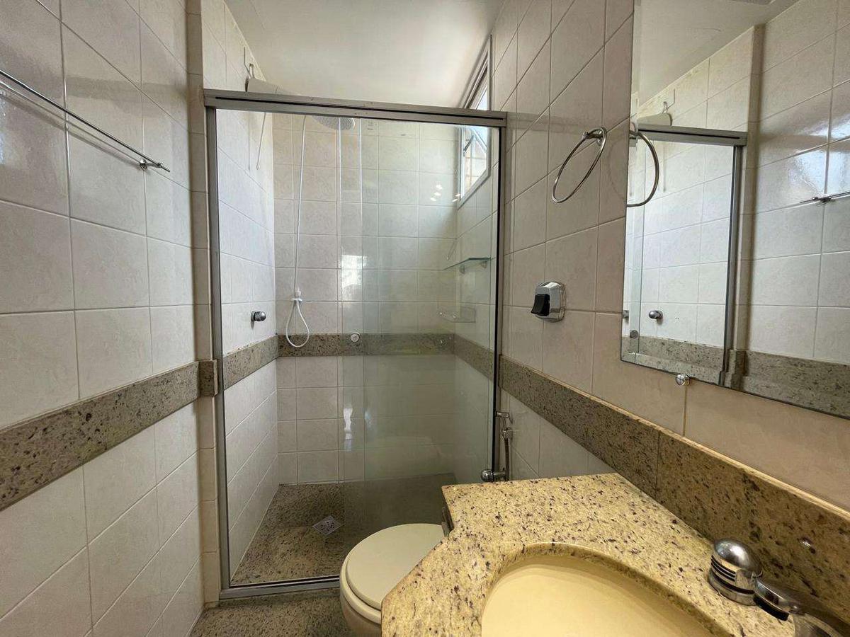 Banheiro social com bancada em granito, armários, espelho e box em blindex.