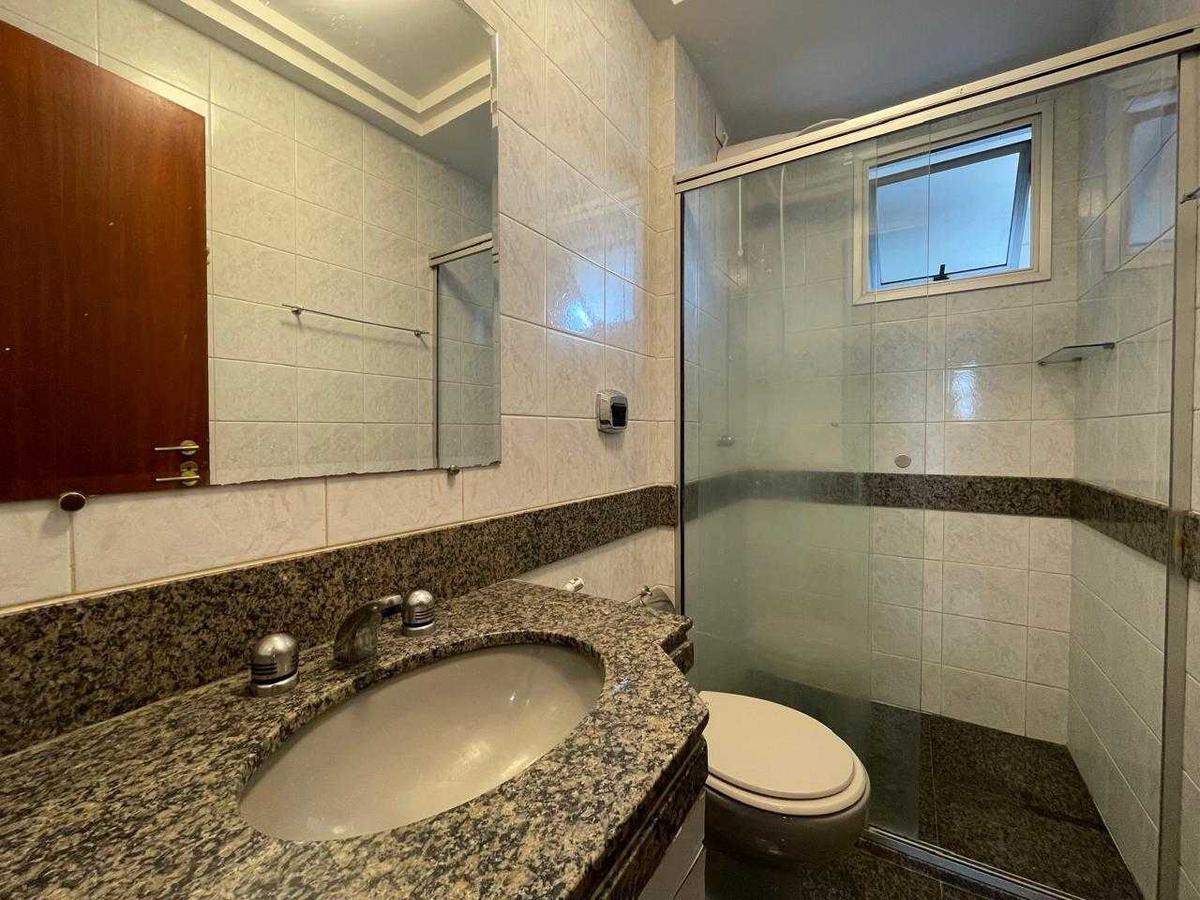 Banheiro social com bancada em granito, armários, espelho e box em blindex.