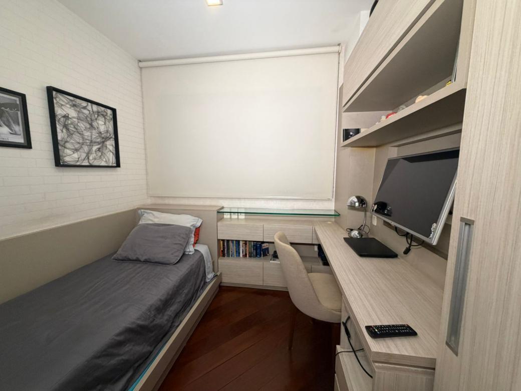 em toda extensao. Area de servico e banheiro de empregada. Corredor e quartos em piso de tabua corrida ipe. 02 quartos com armarios planejados em portas de correr espelhadas sob aluminio anodizado dourado e um estar intimo podendo usar como terceiro quarto. Quarto de casal com suite e armario extenso. Banheiros em granito, todo montado com espelhos, armarios, boxes e acessorios em metal. Banho social com sistema de ventilacao acoplado ao teto. 01 vaga de garagem livre, coberta e demarcada + box de despejo.