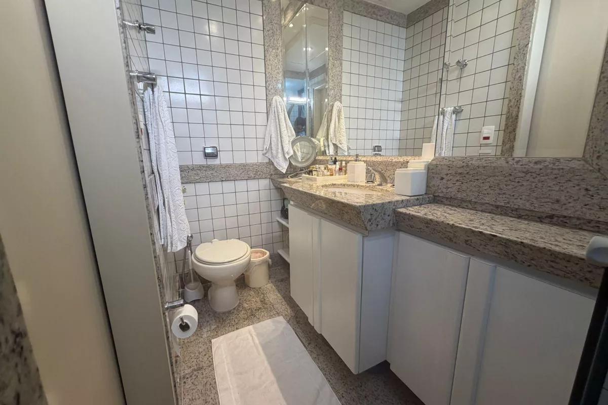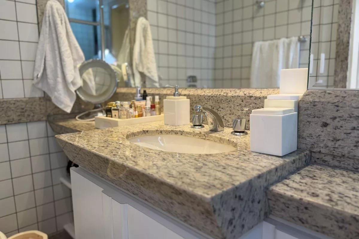 1 Sala ampla para dois ambientes, com piso em granito, teto rebaixado e iluminação planejada 3 Quartos amplos, todos com piso em tábua corrida e armários, sendo uma suíte com bancada em granito, armários, espelho e box em blindex Cozinha espaçosa, com piso e bancada em granito e armários planejados Banheiro social com espelho, bancada em granito, armários e box em blindex Área de serviço com tanque e bancada em granito 1 vaga de garagem livre e coberta