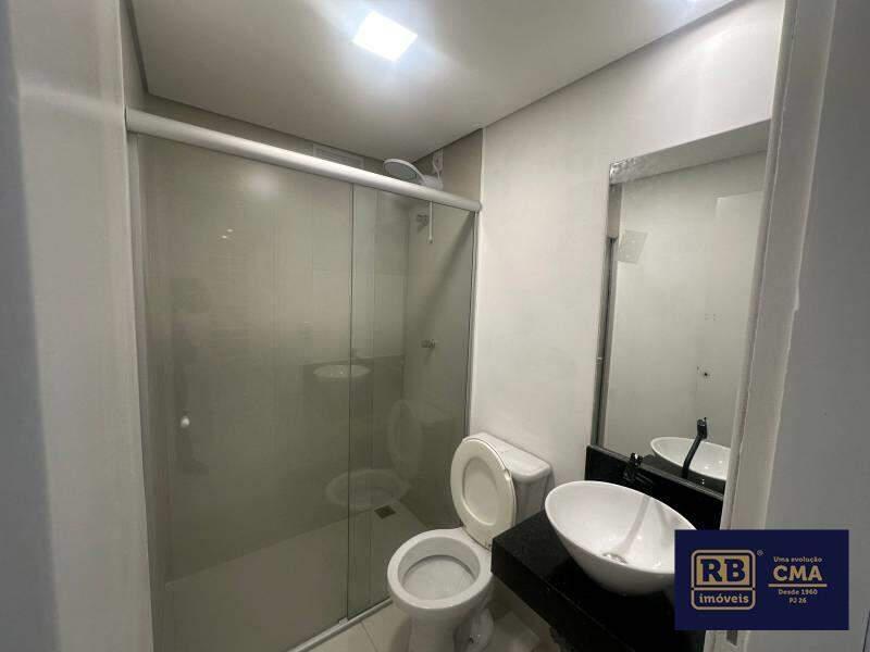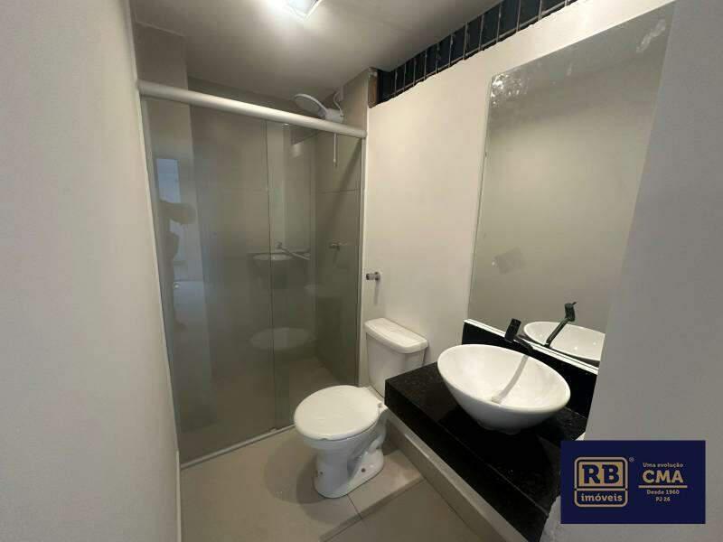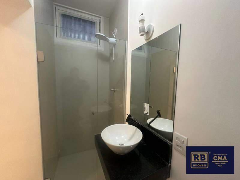 Banheiro social com espelho, pia em cuba de apoio e box em blindex