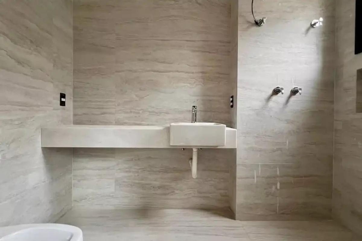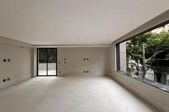 Apartamento de 275m² com três quartos sendo uma suíte, banheiro social, lavabo, sala ampla, cozinha com bancada em granito, área de serviço, varanda e três vagas de garagem.