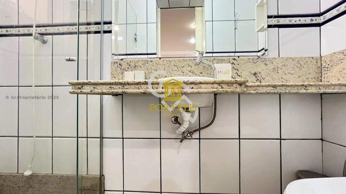 Banheiro social com bancada em granito, espelho e box em blindex