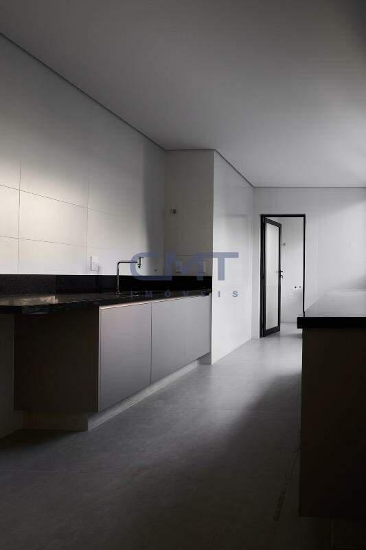 Cozinha ampla com piso em porcelanato e bancadas em granito e armários planejados. Área de serviço com bancada em granito e banheiro de serviço.