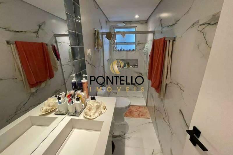 Banheiros (social e suíte) com bancadas em mármore, armários, espelho e box em blindex.