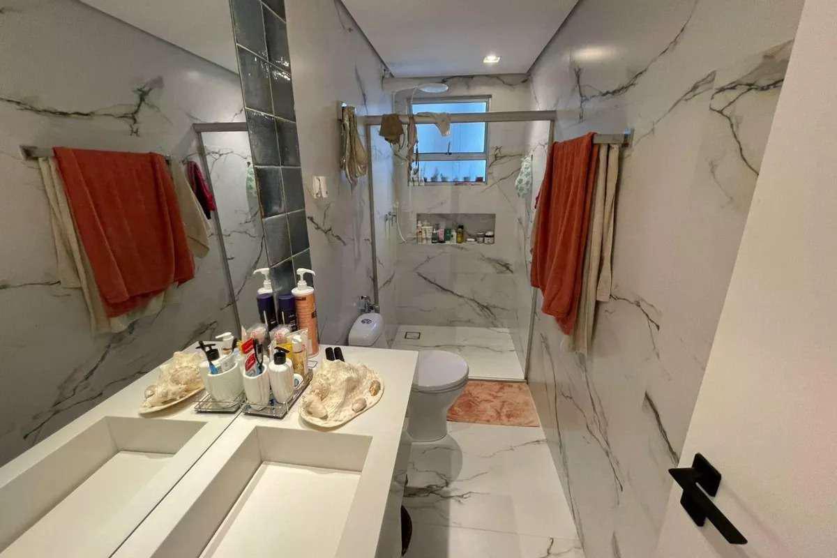 Banheiros (social e suíte) com bancadas em mármore, armários, espelho e box em blindex.