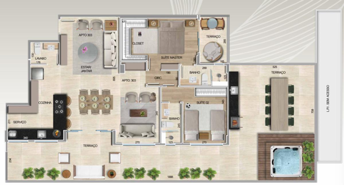 03 quartos sendo 1 suíte master com terraço e 02 semi-suítes; Cozinha integrada á sala; lavabo; área externa privada.