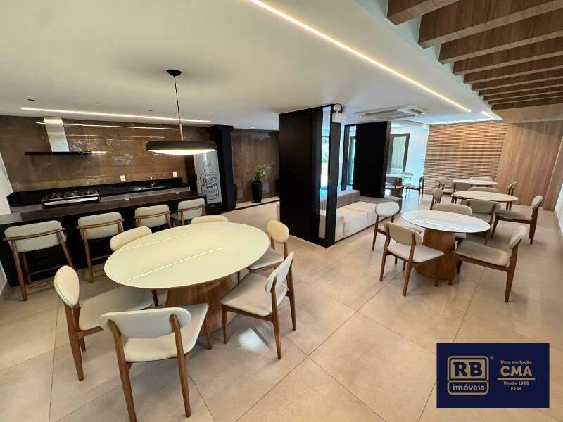 1 Sala de estar e jantar com painel de madeira na parede, iluminação planejada e varanda