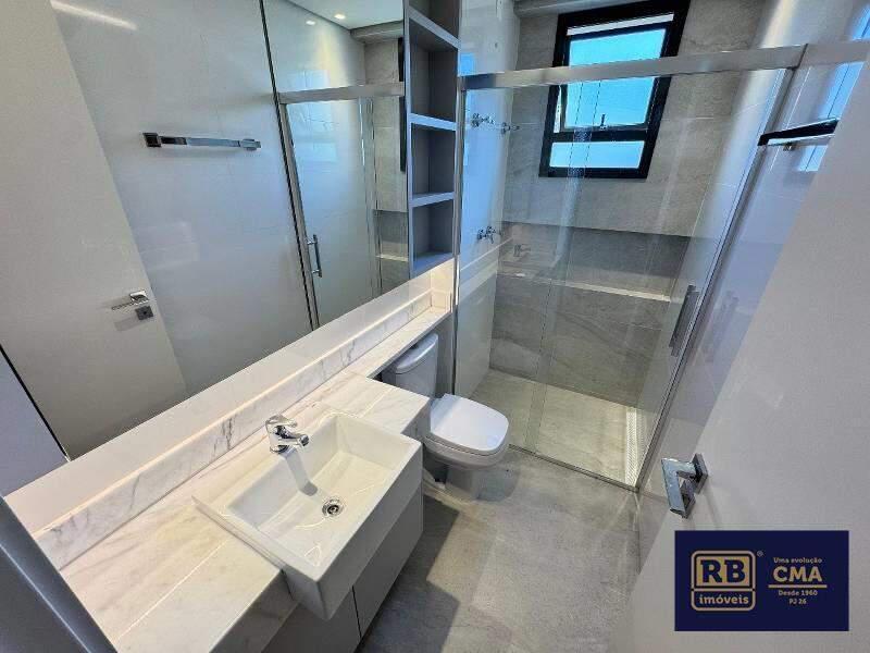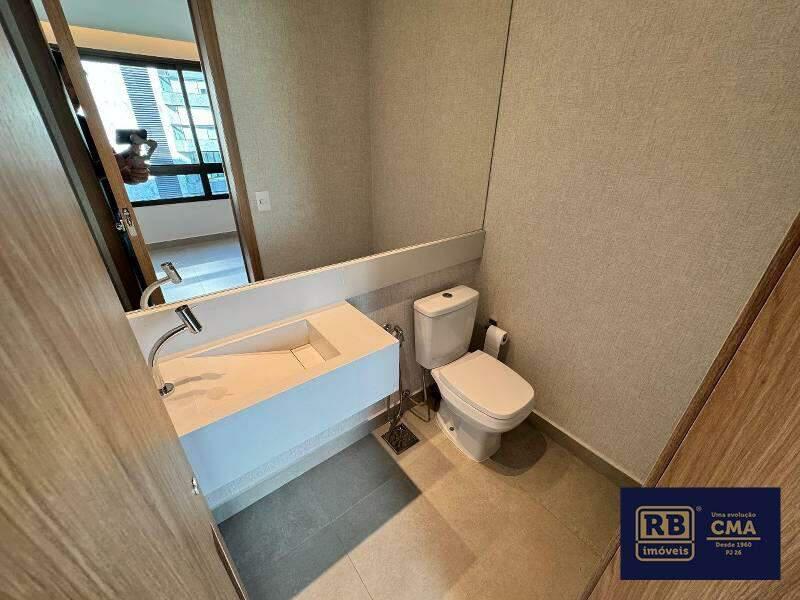 Banheiro social com espelho, nichos, armário, box em blindex e acessórios Monocomando