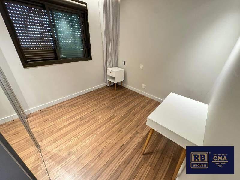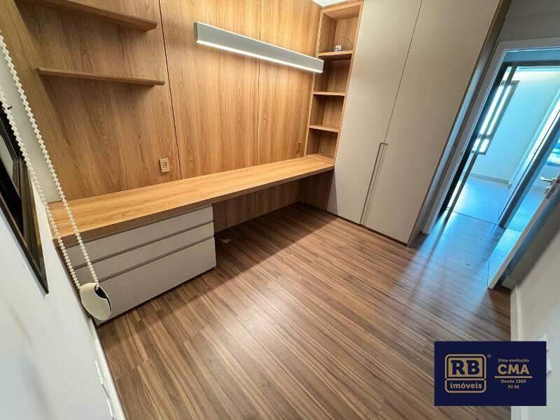 3 Quarto amplo com piso em vinílico de madeira, armários planejados, um transformado em escritório com móveis planejados, sendo uma suíte com armários planejados, cômoda, espelho, pia em coluna e box em blindex