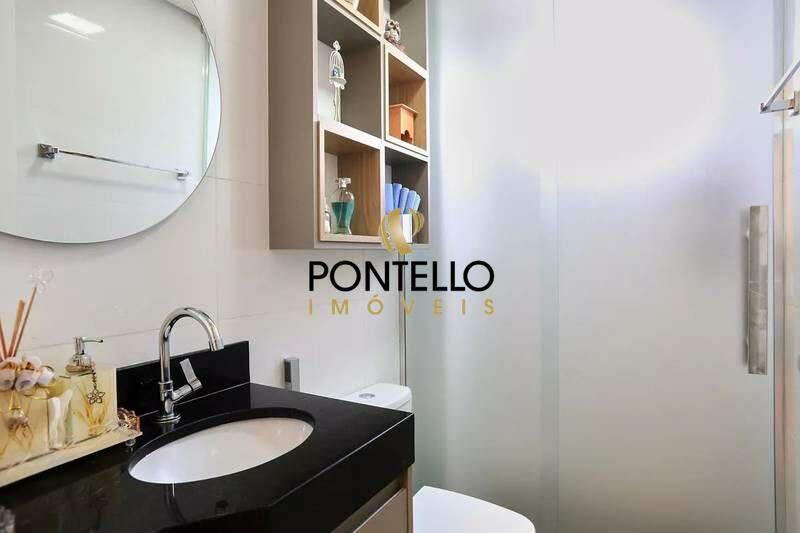 Banho social com armário planejado e box em vidro translúcido fosco