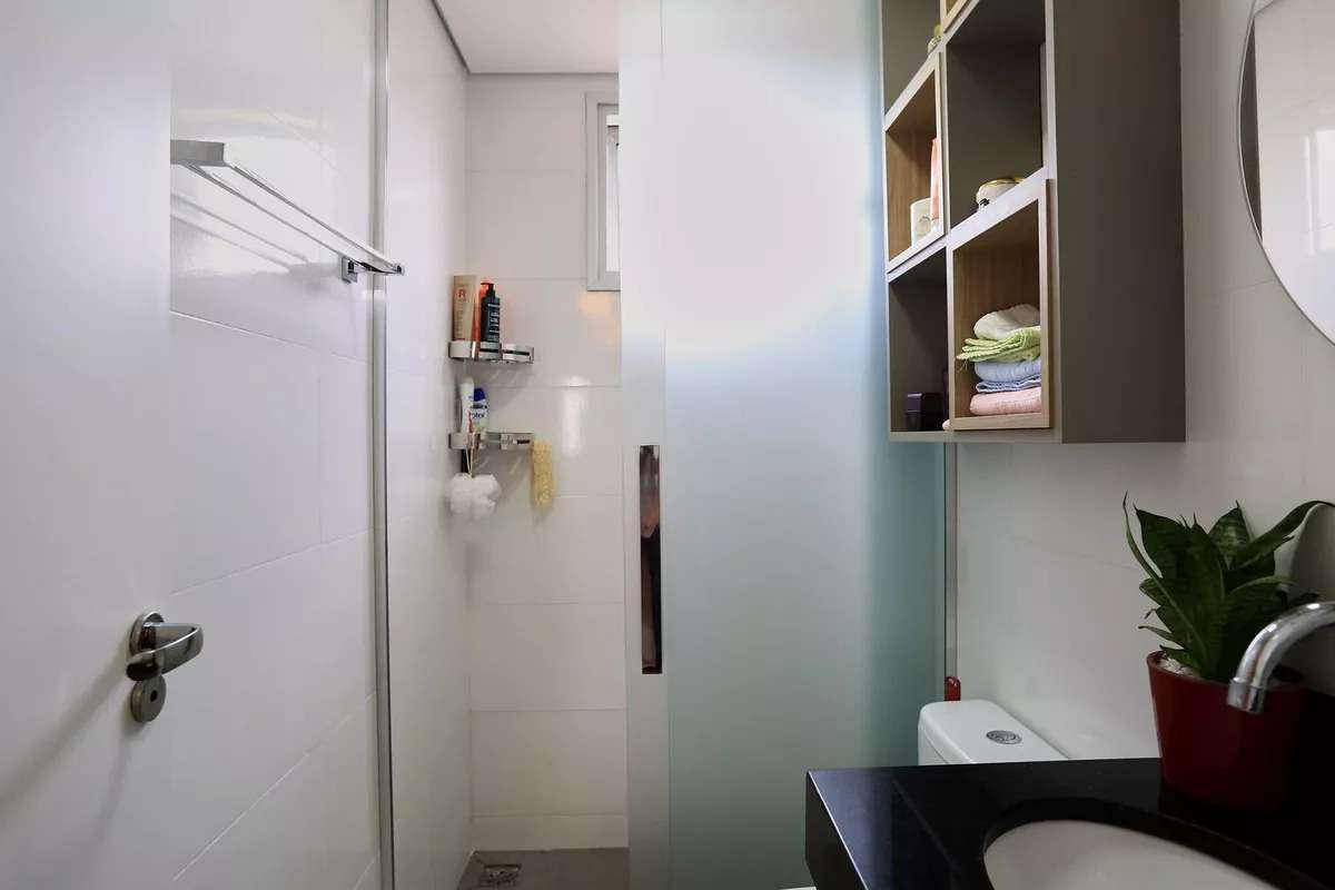 Banho social com armário planejado e box em vidro translúcido fosco