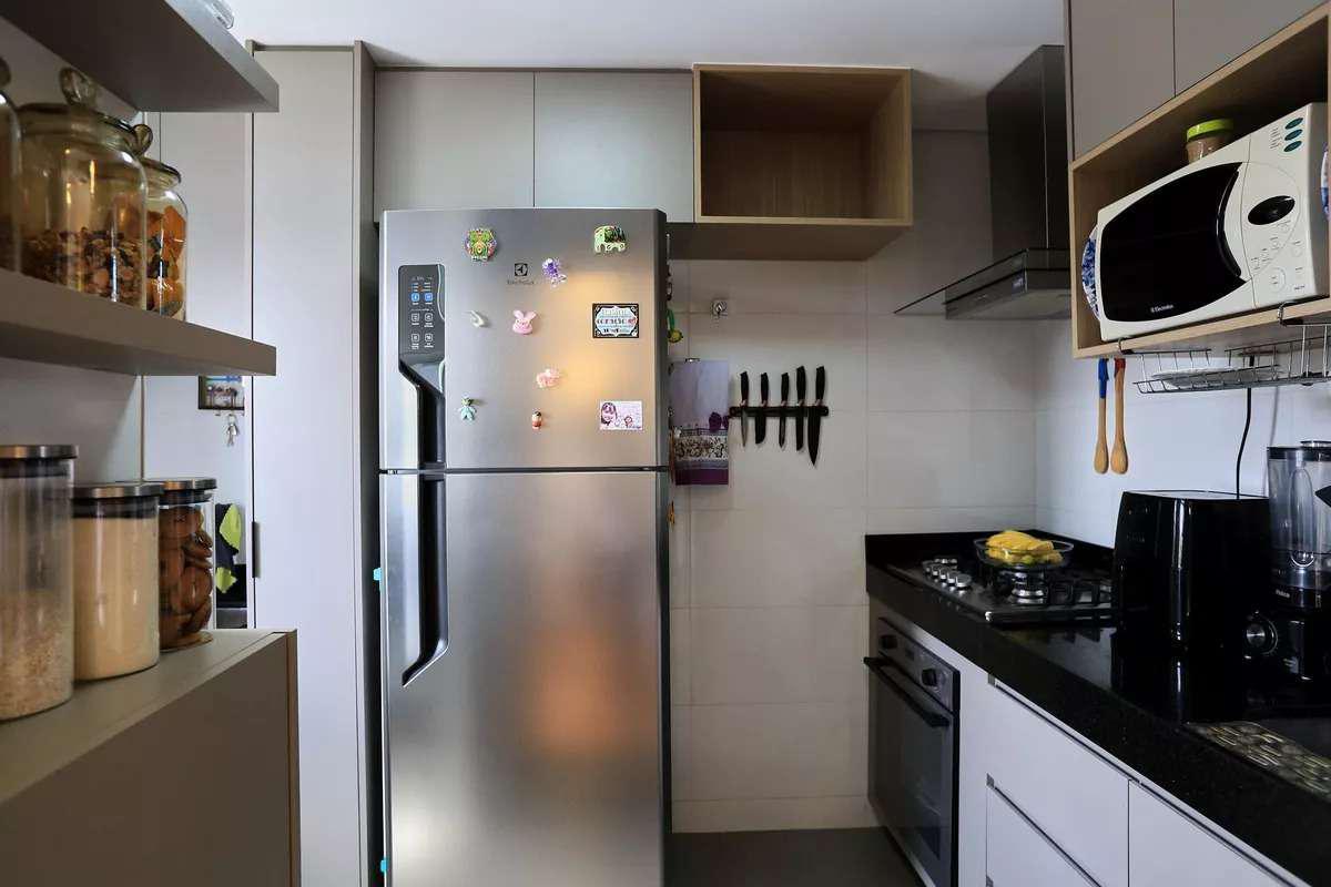 Cozinha com armários planejados e piso em cerâmica