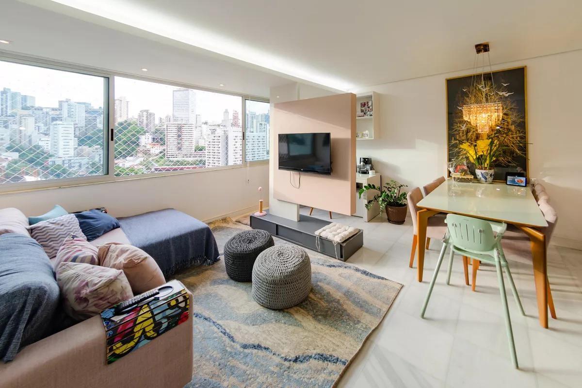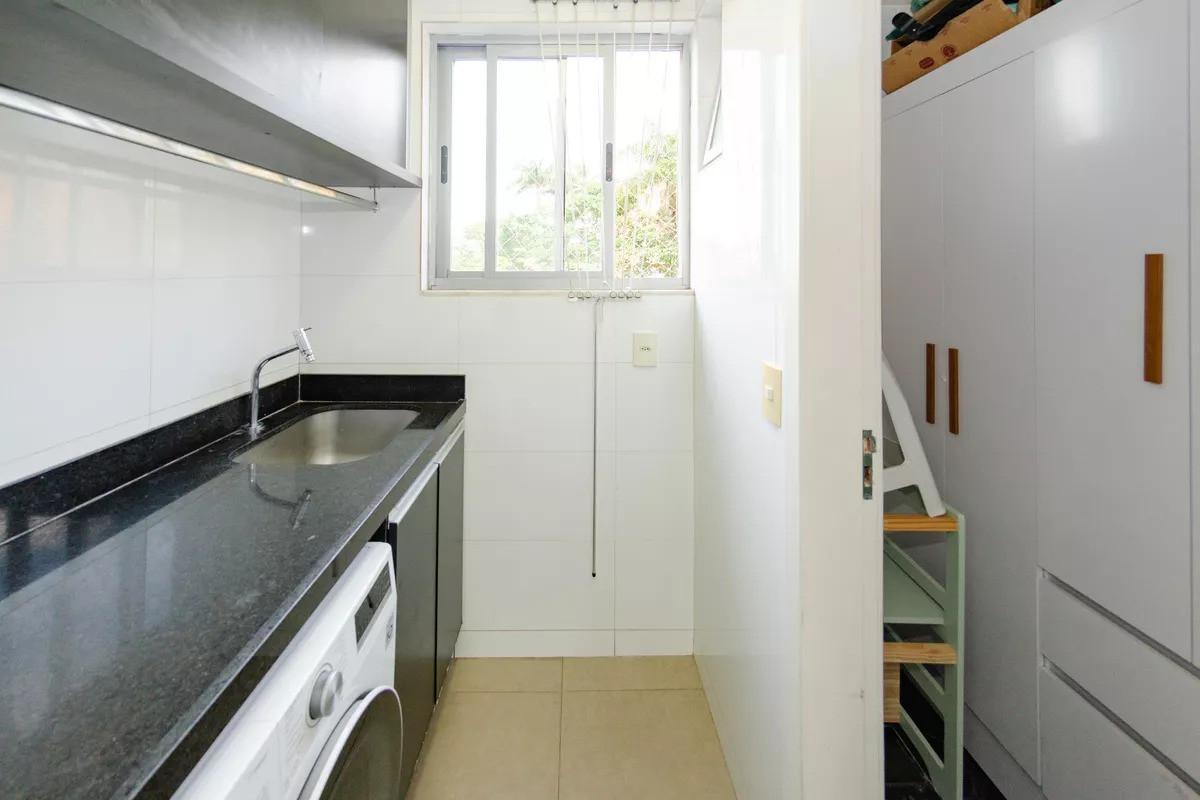 Apartamento com área de 98m², sala ampla para 03 ambientes com piso em mármore, teto rebaixado em gesso, iluminação planejada, rack suspenso para TV e armário embutido, 03 quartos com piso laminado e armários planejados, sendo 01 suíte com cabeceira e penteadeira embutidas, banheiros (social e suíte) com piso em porcelanato, bancadas em mármore, armários e box em vidro, o banheiro da suíte conta ainda com armário sob a pia e armário suspenso com espelhos, cozinha americana com cortina de vidro, armários planejados, cristaleira, ampla bancada em granito e piso em porcelanato, despensa e área de serviço.