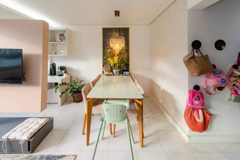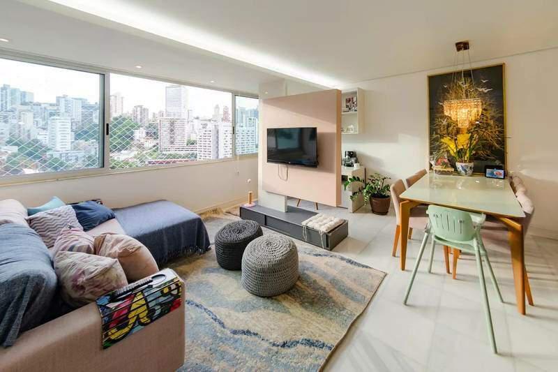 Sala ampla para 3 ambientes, com piso em mármore, teto rebaixado em gesso, iluminação planejada, rack suspenso para TV e armário embutido, proporcionando sofisticação e excelente integração dos espaços.