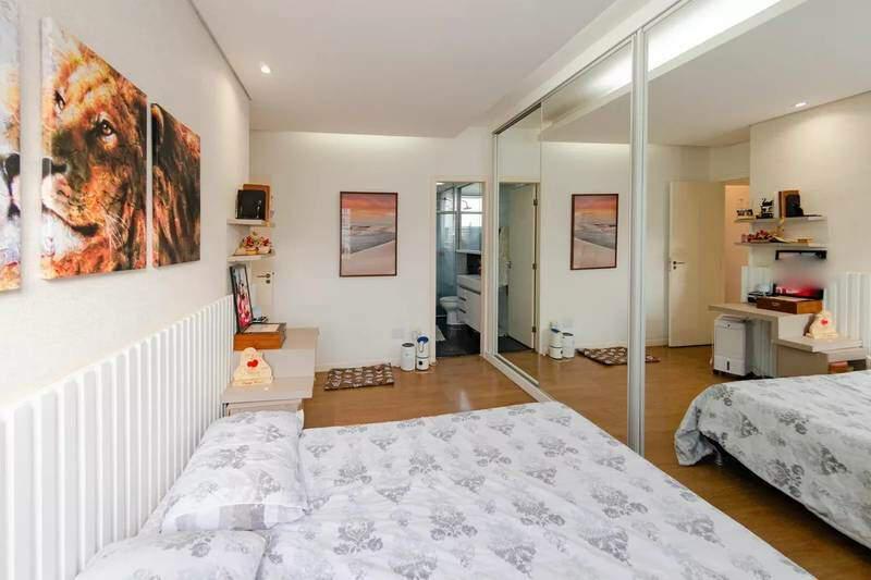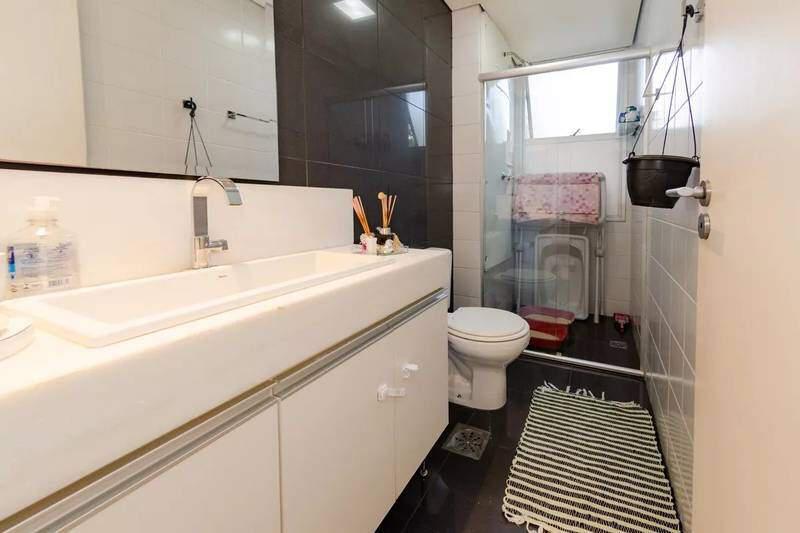 Banheiros (social e suíte) com piso em porcelanato, bancadas em mármore, armários e box em vidro. O banheiro da suíte conta ainda com armário sob a pia e armário suspenso com espelhos.