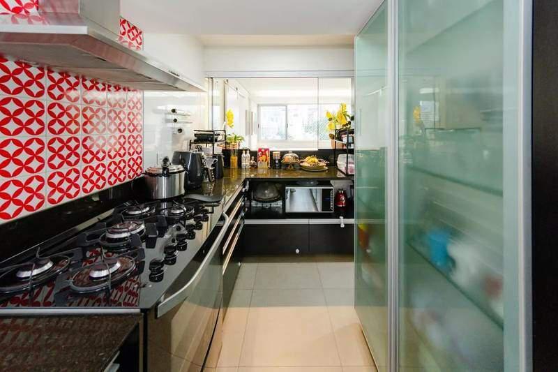Cozinha americana com cortina de vidro, armários planejados, cristaleira, ampla bancada em granito e piso em porcelanato.