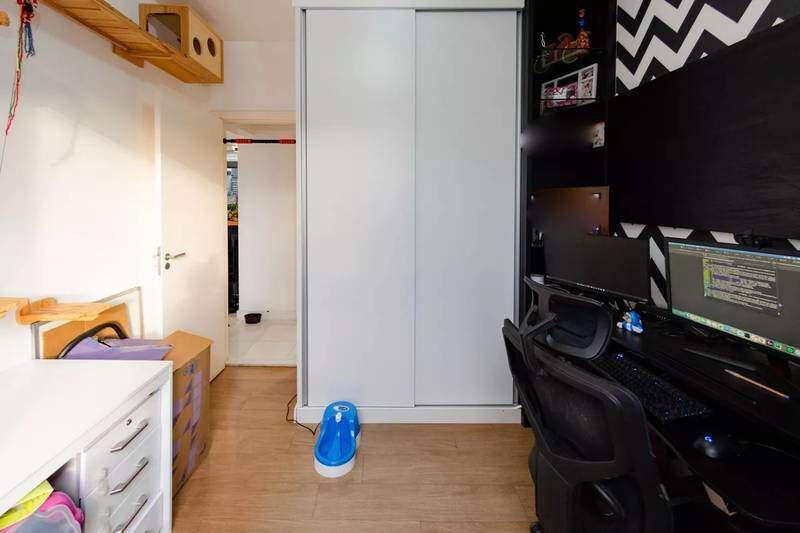 3 quartos com piso laminado e armários planejados, sendo 1 suíte com cabeceira e penteadeira embutidas.