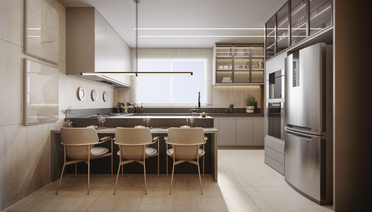 ] Cozinha ] planejada, com armários, e pia e armários em bancada península, com mesa de assento embutida, e cozinha com revestimento em porcelanato .