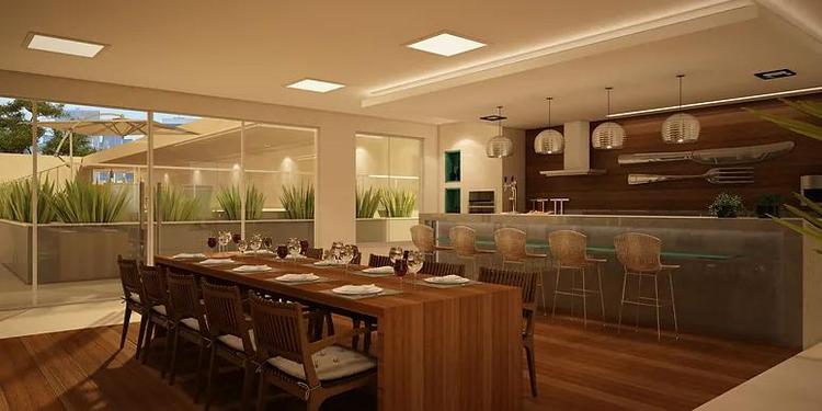 Salão para três ambientes com varanda gourmet, lavabo, painel de