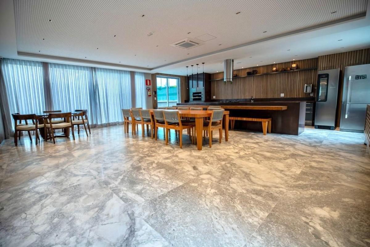A cozinha gourmet é o destaque do imóvel, moderna e equipada, conta com um sistema acústico e espaço para adega, além de ar-condicionado.