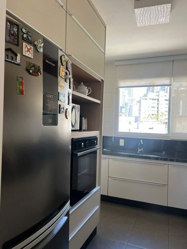 Espaço gourmet equipado com cooktop, filtro, coifa em inox, armários, freezer, mobiliário e televisão