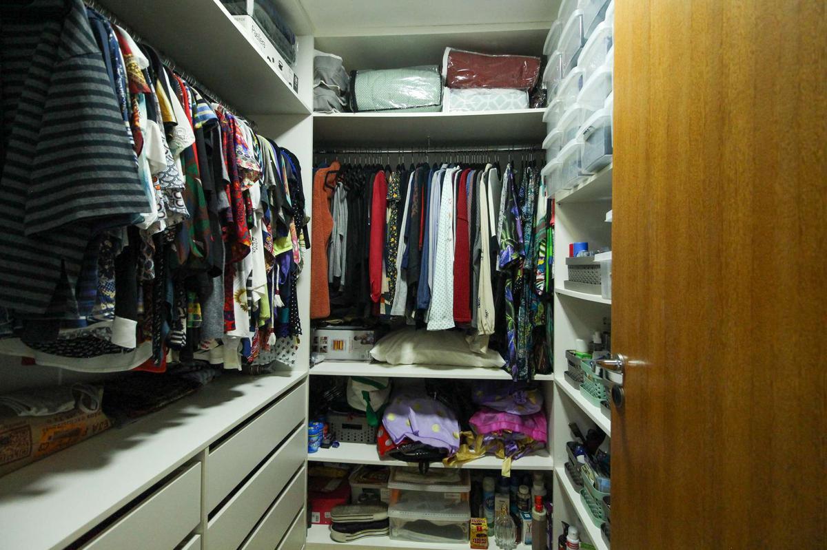 Suíte: Suíte equipada com armário e box, com piso em porcelanato.