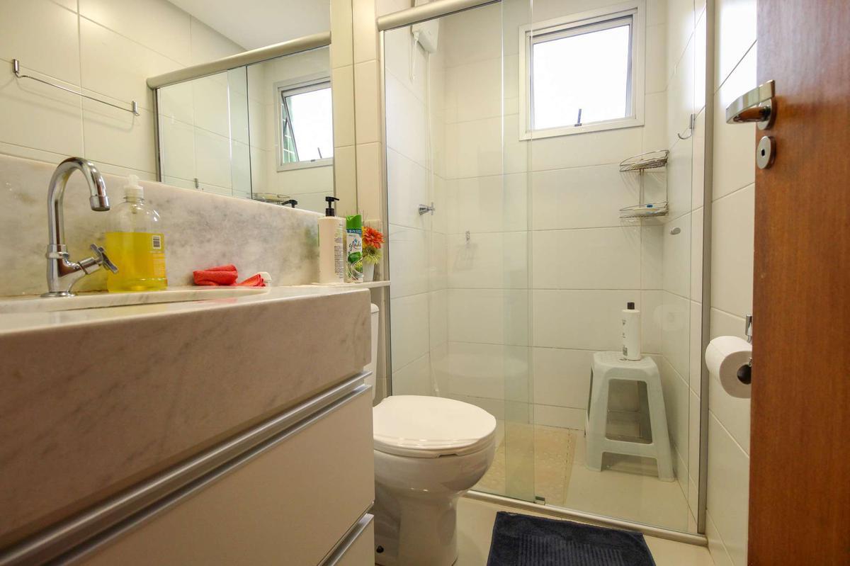 Banheiro Social: Banheiro social com armários e box, também em porcelanato.