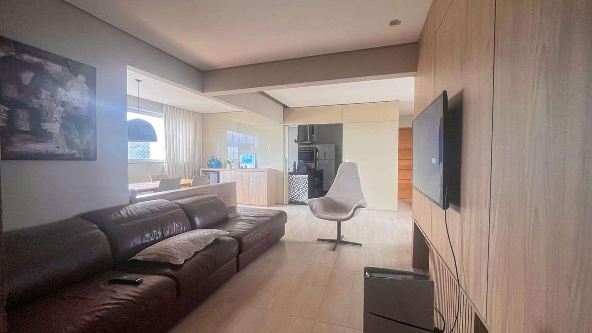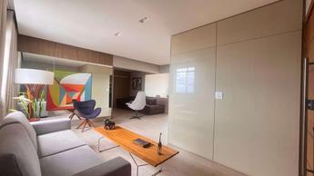 Sala espaçosa para três ambientes, com piso em porcelanato, projeto de iluminação e varanda integrada.