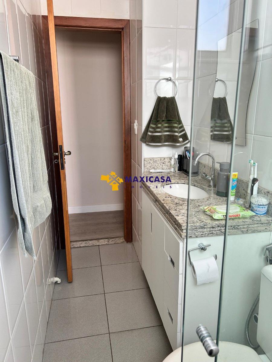 2 Banheiros, social e suite, cozinha e área de serviço em piso porcelanato e paredes revestidas de cerâmica.