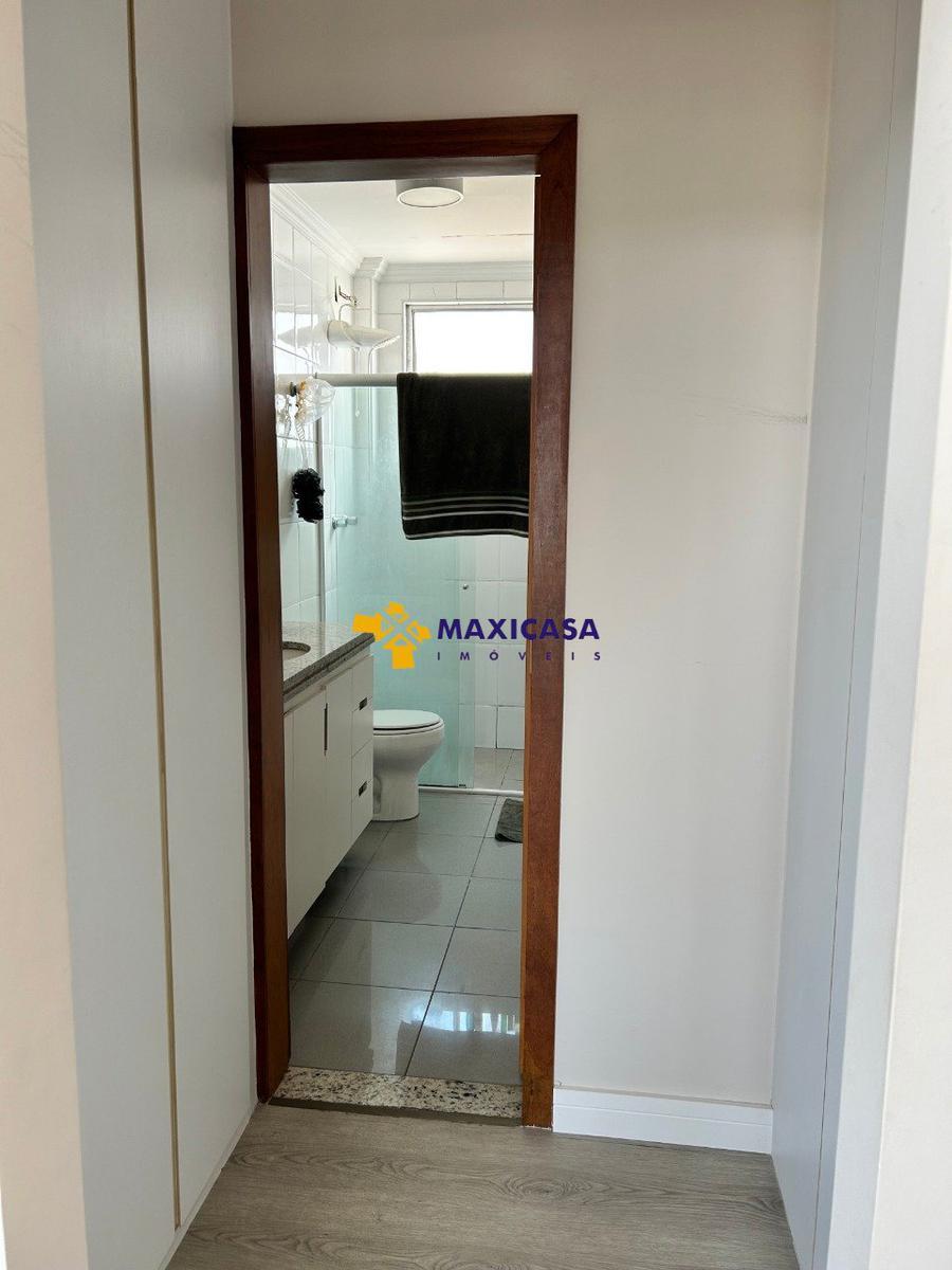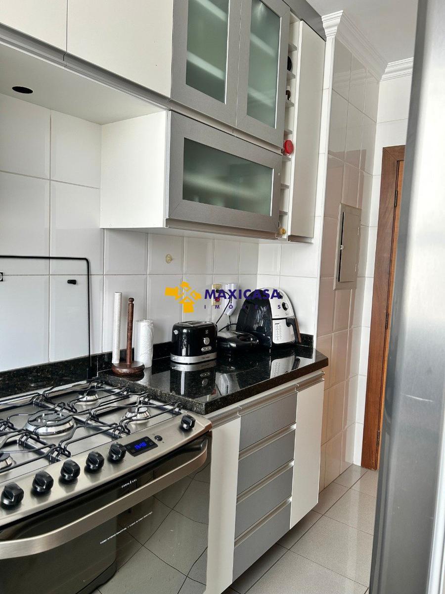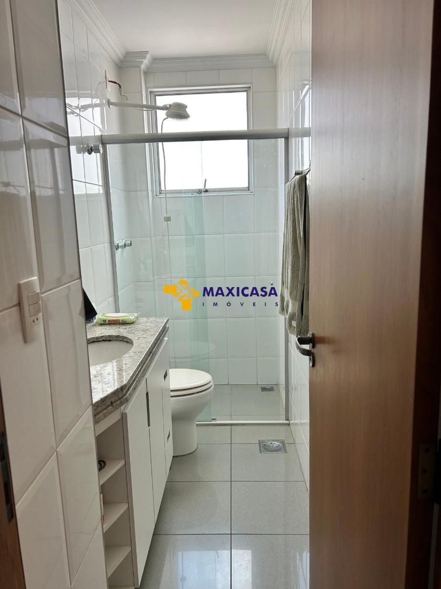Banheiros, cozinha e área de serviço com armários, piso porcelanato e paredes revestidas de cerâmica.