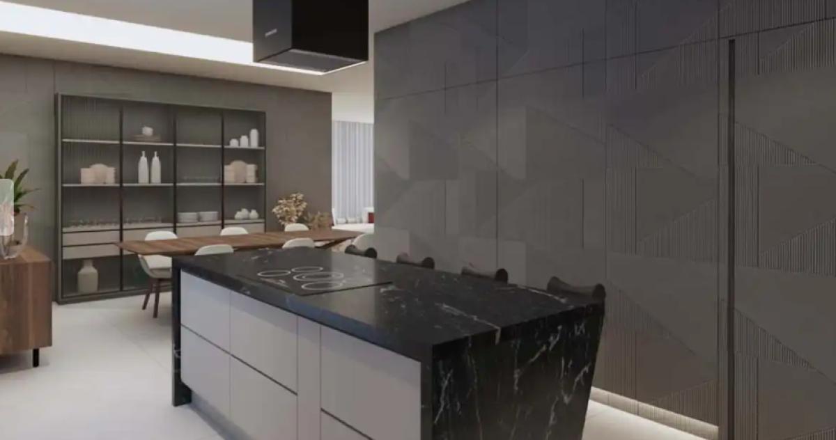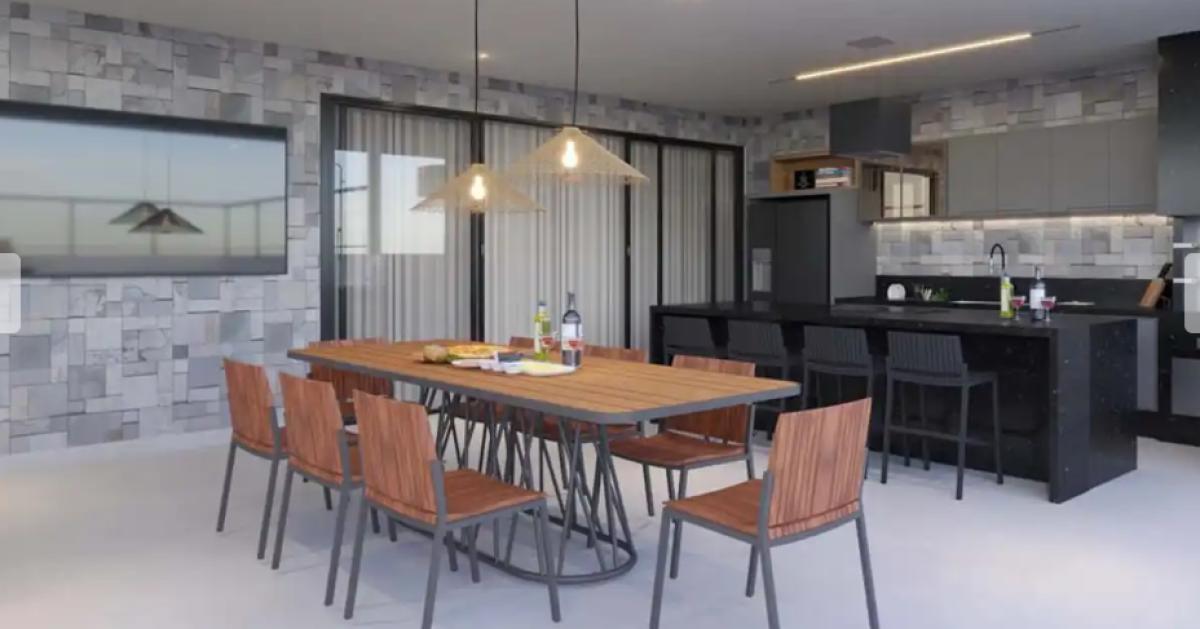 Sala integrada com jantar e cozinha.