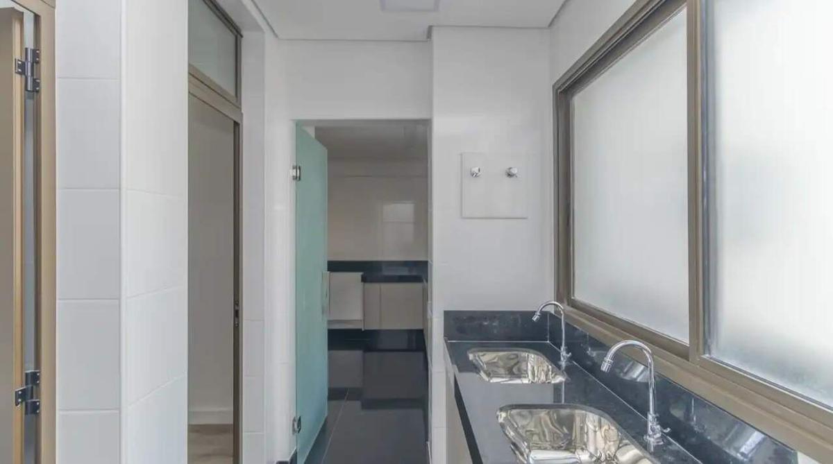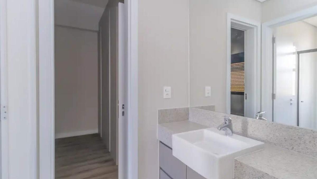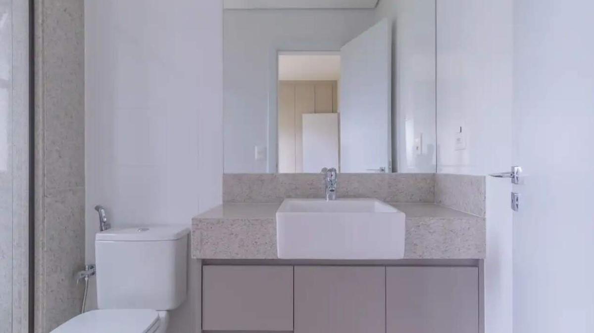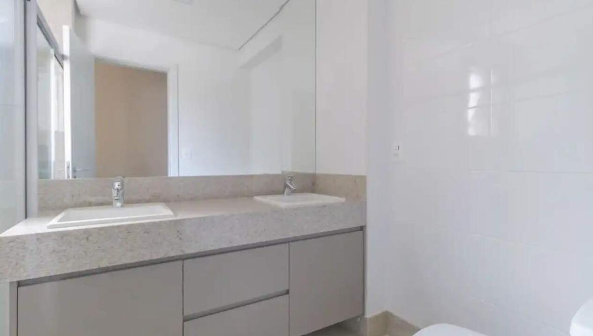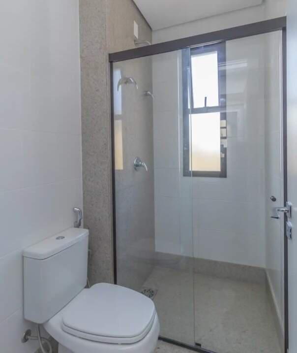 Banheiros com espelho, armário e box em blindex