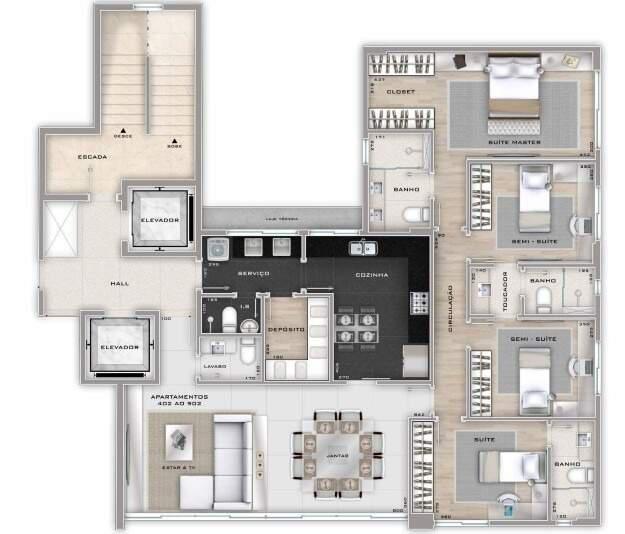 Sala ampla para 03 ambientes com piso em porcelanato, iluminação planejada, lavabo, 04 quartos confortáveis com armários, piso em laminado de madeira e janelas com venezianas integradas sendo 02 suites (a máster com closet) e 02 semi suites, cozinha espaçosa com armários planejados, piso e bancadas em granito, área de lavanderia independente, quarto e banheiro de serviço.