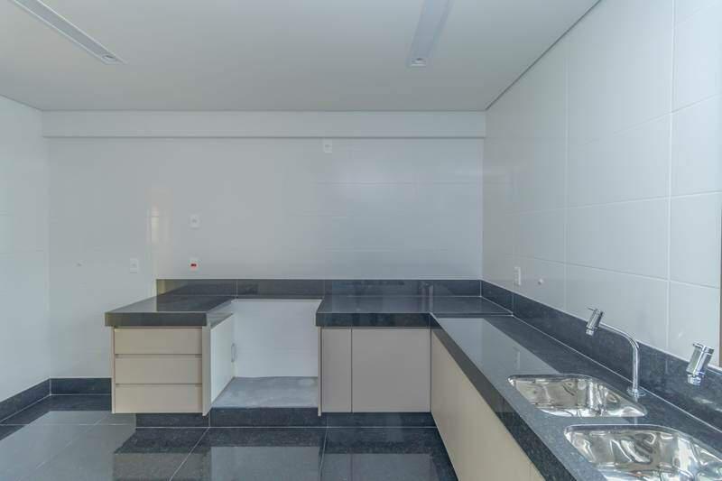 Cozinha prática e bem distribuída, com armários planejados, bancadas e piso em granito.