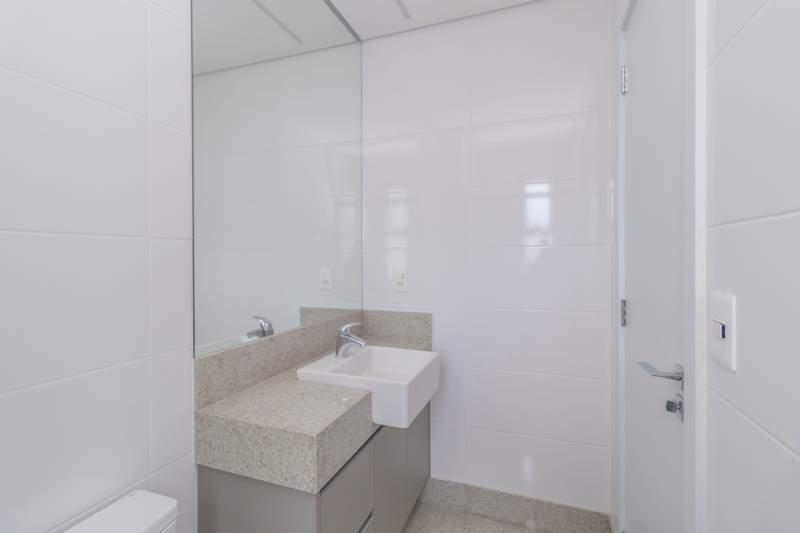 Banheiros com acabamento de alto padrão, equipados com armários, espelhos e box em blindex.
