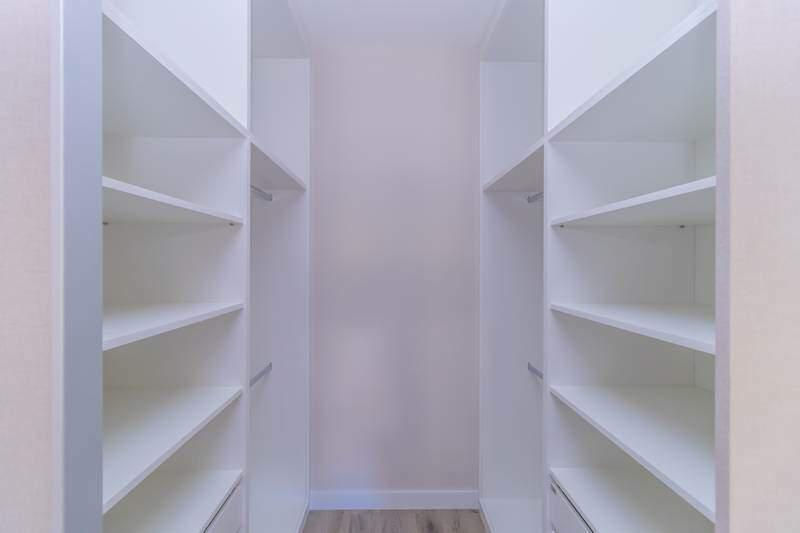 Banheiros com acabamento de alto padrão, equipados com armários, espelhos e box em blindex.