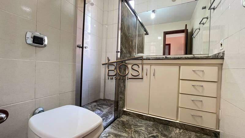 - Banheiro social com bancada em granito, espelho, armários planejados e box em blindex