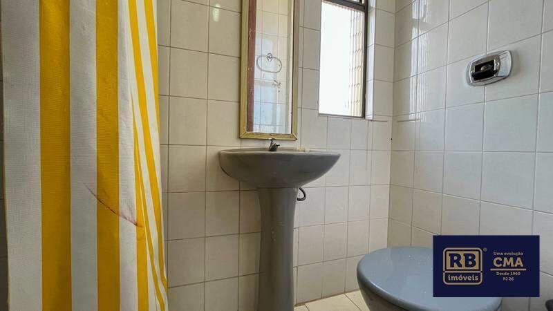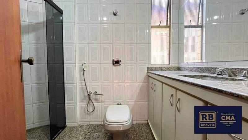 Banheiro social com bancada em granito, espelho, armários planejados e box em blindex