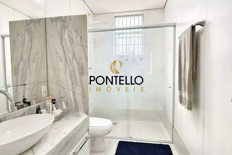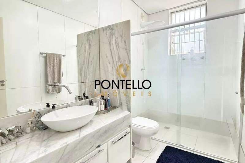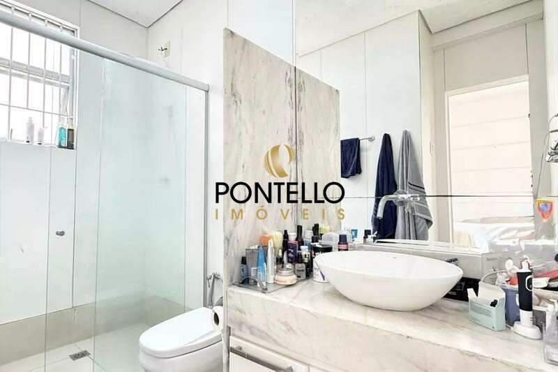 Banheiros (social e suíte) bem equipados, com box em blindex, bancadas em granito e espelhos.