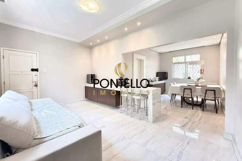 Sala em ¿L¿, ideal para até três ambientes, com piso em mármore e teto rebaixado com sofisticado projeto de iluminação planejada, proporcionando conforto e elegância ao espaço.