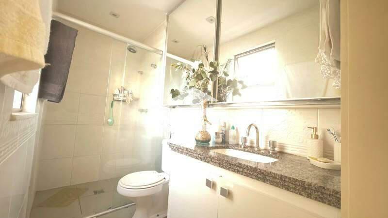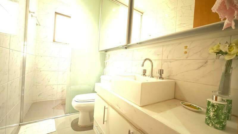 Banheiro social com acabamento de alto padrão e água aquecida nas pias