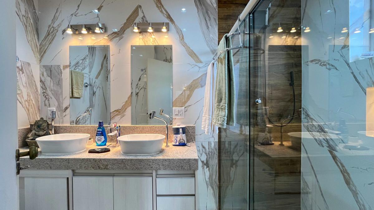 Banheiro social com armários planejados, espelho e box em blindex
