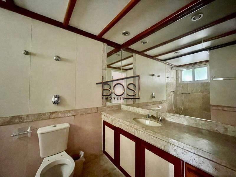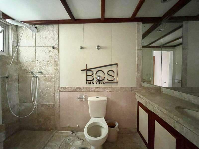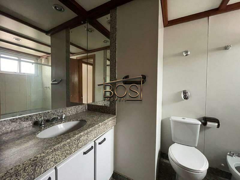 - Banheiro social com espelho, bancada em granito, armários, bide, banheira e box em blindex